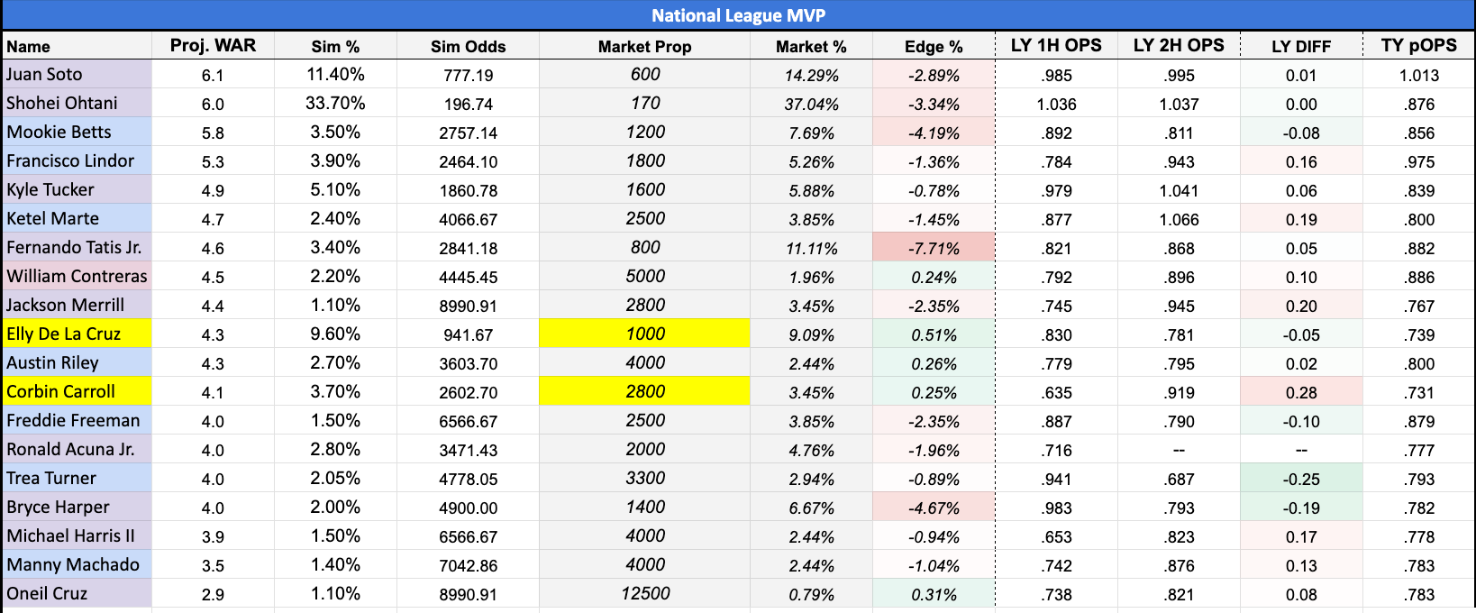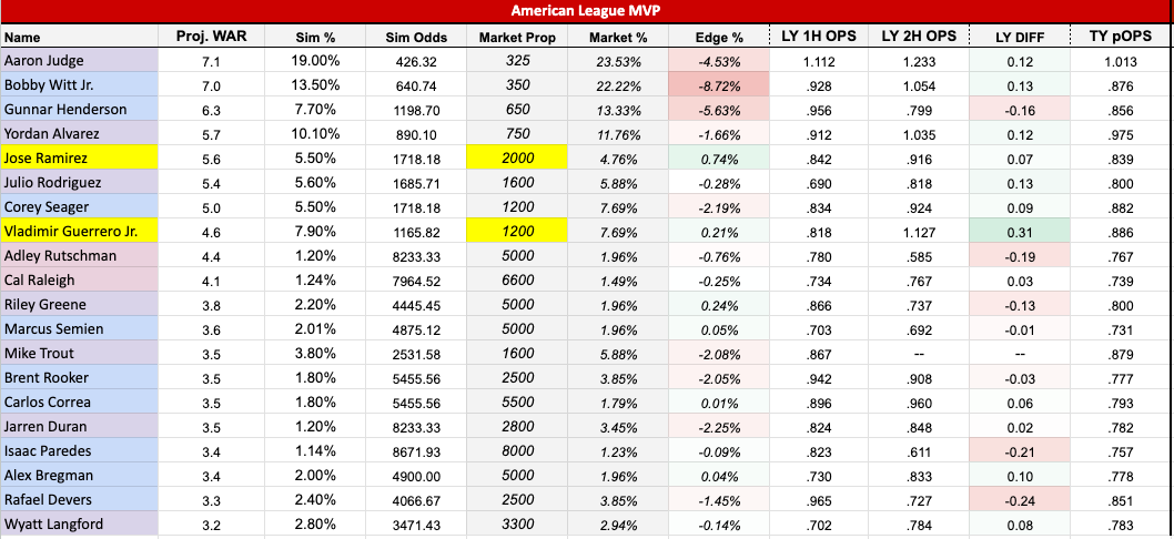 Bobby Witt Jr. (+350): From a pure talent perspective, it's hard not to invest in Witt even at this short price, but the simulation does not render any value. His dominance with the bat and on the base paths while playing at a premium position makes him a heavy favorite, which is reflected in the price.