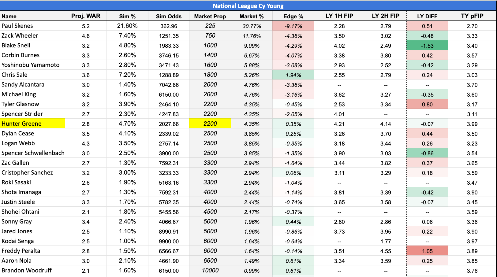 When you view this chart, the most obvious candidate that stands out under the "Edge%" column is Chris Sale of the Atlanta Braves. His WAR, FIP, and ERA projection combine to be a very compelling case for his Cy Young candidacy. However, given his injury history, I would prefer to refrain from investing here and go with a more up-and-coming star for the Cincinnati Reds.