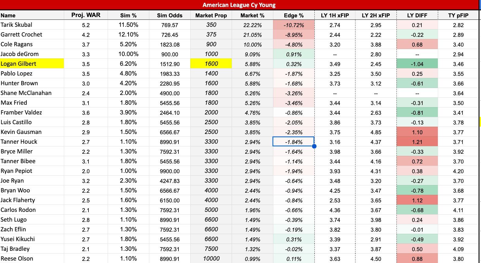 Logan Gilbert (+1200) was dominant after making a key adjustment to his arm slot position, which resulted in an uptick in velocity, and an adjustment to his pitch mix using the fastball slightly less. These changes resulted in his ERA and FIP decreasing, while the K/9 rate increased, especially when you take a look at his splits in the first and second halves of 2024. I believe for these reasons, his price in the market has value compared to anyone else in the field. It's also worth noting (as I did in the stat projection blog), that his home starts at T-Mobile park offer an added advantage based on park factors–although the voters for this award take into consideration park-adjusted rates for ERA and FIP, this advantage could help boost his counting stats which are not adjusted for the park.