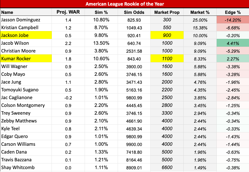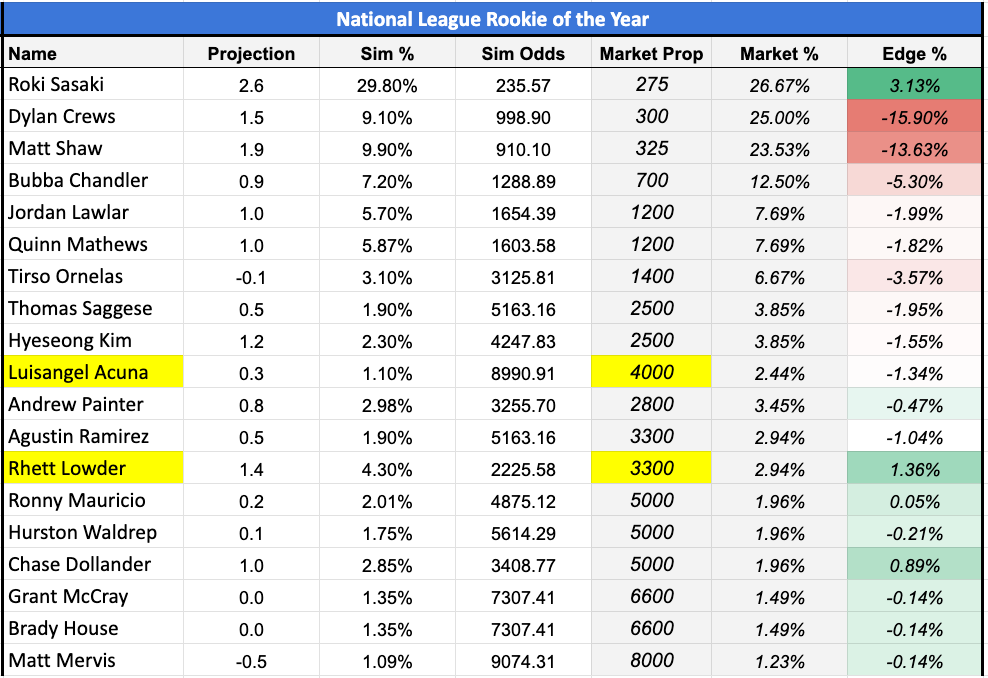 Roki Sasaki stands out in the NL market as the leading candidate to generate the highest WAR, and it's not really close. His short odds reflect this, and the simulation couldn't help but to generate his chance of winning the award near 30% of the time, which is higher than his market price +275 (26%) suggests.