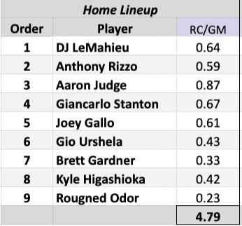 In some of my articles, you’ll see the projected lineups along with the projected Runs Created for each individual player. Which looks like this: