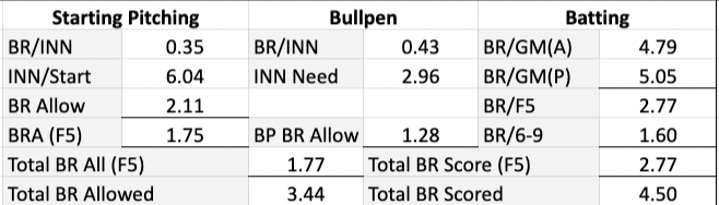 - Run Scoring Environment: Each month there is an assigned value for run scoring based on season long league average. This is simply to reflect the month in which a game is played in and the expected runs (+/- the percent difference).