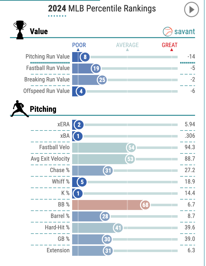He generates fly balls at a much higher rate than ground balls, which in 2024 was largely due to his high usage of the 4-seam fastball compared to the sinker or cutter. A plausible explanation for this is that he had trouble commanding the sinker and cutter consistently, and would rather not give up walks at a high rate (proven true in the chart below). His Stuff+ grades measure at or below league average, resulting in Whiff and K rates in the lowest percentile across the bigs. Average "stuff" and the inability to generate swing-and-miss combined, hitters were able to create hard hit and barreled balls at a very high rate, resulting in the core reason his advanced metrics show so poorly.