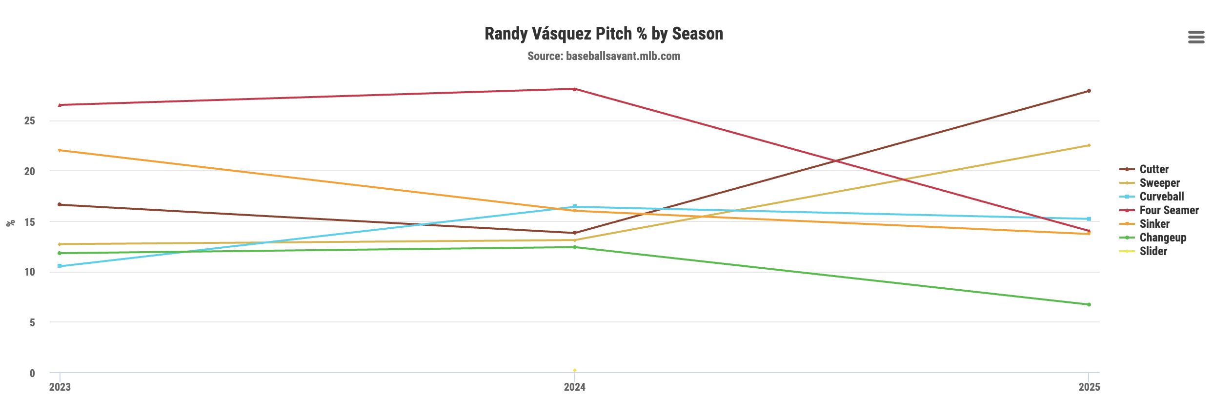 For those not familiar with his game, Randy Vasquez largely struggled to find his way as a consistent, productive starter during his first full year as an MLB starter in 2024 after coming to San Diego from the Yankees in the Juan Soto trade.
