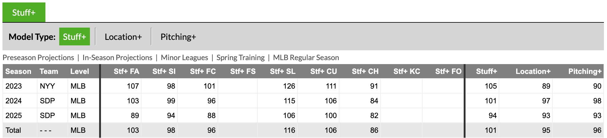 I think we're at a pivotal point in the data collection and analysis of this curious phenomenon that we're witnessing. Sure, there are areas of concern, such as his high walk rate, the fly ball to ground ball ratio, combined with his slightly below average Barrel rate allowed, and the Stuff+ grading that indicates none of his pitches are above average. But the success he's had thus far in 2025 seems to be highly correlated with the average stuff and unpredictable pitch mix, which may be partially due to his lack of command, if not the obvious changes to pitch utilization.