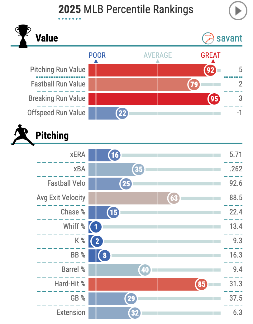 These changes have significantly improved his effectiveness despite the advanced numbers hating on him, as he's now able to create weak contact at a high rate and limit barrels to a minimum. It's also helping his "Run Value" ratings per Baseball Savant, to flash red in a way they did not in 2024. He's still allowing more fly ball contact than ground balls and is actually creating less swing-and-miss than last season. Although the decreased strikeout rate is not a concern of mine, he's posting his highest walk rate of his career (6.10 BB/9, up from 2.66 in 2024). He's essentially become a pitcher who mixes his pitches well, creates soft contact, and aims to stay within himself without giving up too many free passes–so far, he's done this well.